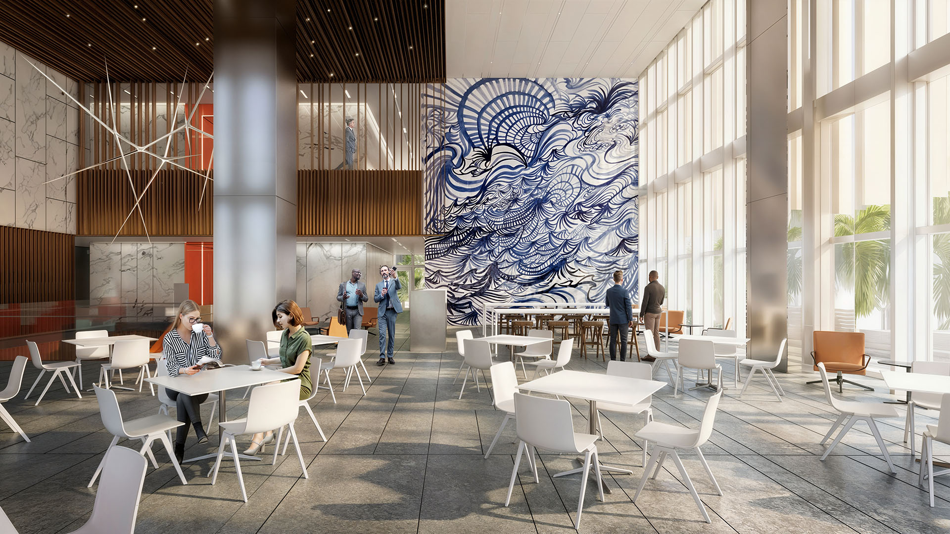 Monumental canopies mark the primary entries of the chancery. Formal plazas at the main entry, flanked by water features andgardens, house a covered multi-use outdoor reception and event space. Consular visitors access diplomatic service by ascending a brightly colored processional ramp, serving as an orchestrated visitor flow stratagy and familiar modernist gesture.